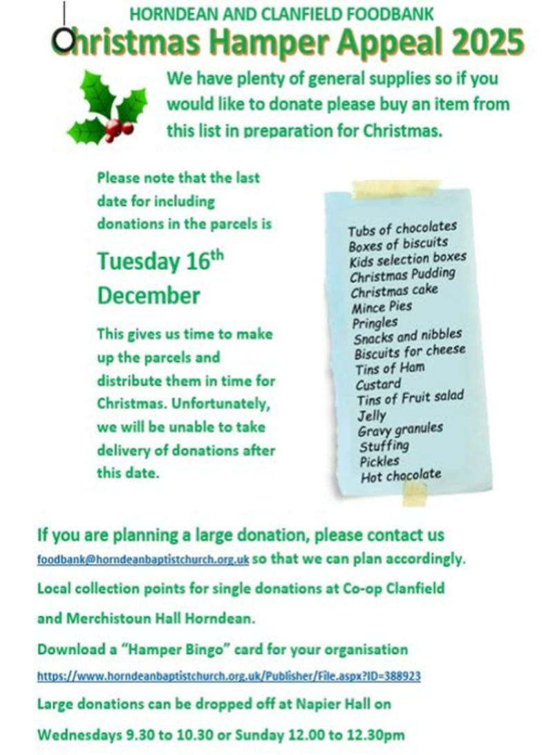 In addition to the usual appeal for donations to the Foodbank, at this time of year the Horndean and Clanfield Foodbank prepares Christmas Hampers for those in need. Details of suggested donations for the hampers are shown in the adjacent image.