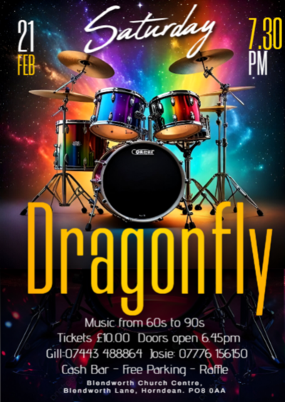 Come and enjoy music from the 60s through to the 90s from Dragonfly at the Blendworth Church Centre on Saturday 21st February. Doors open at 6:45pm. Tickets are £10 each with an additional £0.50 booking fee. There will be a cash bar and raffle during the evening.
